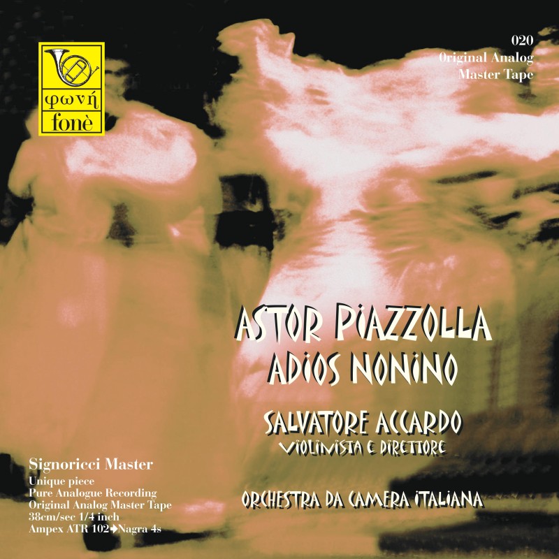 I recorded this album at Pontificio Istituto di Musica Sacra in Roma on May 2001. The absolute protagonist is the Maestro Salvatore Accardo, violinist and conductor of the Italian Chamber Orchestra. To underline the violin version by Accardo of the most famous piece "Adios Nonino" which gives the title to the album. In this piece Accardo plays with the great pianist Laura Manzini. The relationship between the musician Astor Piazzolla and Salvatore Accardo was one of friendship and great mutual respect For this recording I used the original tube microphones Neumann U47, U48, M49 and all my equipment: mike pre-amplifiers, digital, line, microphone and supply cables Signoricci. Also for this recording I used a "field effect" recording technique, natural sound, without the use of equalizers, no sound expansion and compression systems ... all this to make the listener live in his own system domestic hifi the live effect as if he was present at the performances.