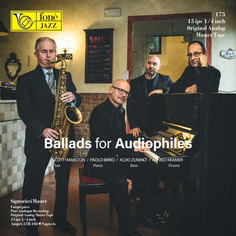 I protagonisti di questo album sono Scott Hamilton - sax, Paolo Birro - piano, Aldo Zunino - bass, Alfred Kramer - drums Ballads for Audiophiles fa parte dei progetti musicali realizzati a Certaldo Alto (FI) nell'antica cantina del Palazzo di Scoto di Semifonte. Per valorizzare l'affascinante acustica di questo luogo Giulio Cesare Ricci ha utilizzato il sistema di registrazione Signoricci interamente analogico e valvolare. Sono stati utilizzati per l'incisione i leggendari microfoni originali a valvole Neumann U47, U48, M49 Il master è stato realizzato da Giulio Cesare Ricci con l'Ampex ATR 102 2 tracce 1/2" 30 ips I brani sono stati eseguiti dall'inizio alla fine senza manipolazione del suono, nè equalizzazione, nè riverbero, nè compressione ed espansione...ma suono naturale con timbrica vera, no editing. Il "Signoricci", questo è il suo soprannome nel mondo audiofilo, non lavora con microfoni di supporto che ingrandiscono i singoli strumenti come sotto una lente, bensì con i suoi amati microfoni a valvole Neumann che lui stesso posiziona in modo da creare un campo sonoro naturale. In questa incisione tutto questo è riuscito talmente bene che si ha la sensazione di partecipare ad un concerto live. I musicisti si posizionano su un palco immaginario mantenendo una certa distanza dall'ascoltatore. Gli altoparlanti sembrano svanire. Ci vuole un attimo prima di riuscire ad abituarsi a questa esibizione relativamente povera di effetto rispetto alle comuni registrazioni. Però non bisogna attendere molto prima di scoprire il suo fascino, fascino che crea un cosmo sonoro vivente e che da importanza all'insieme invece di separare nettamente gli strumenti uno dall'altro. Anche il suono del sassofono, nonostante sia deciso, è sempre vellutato e non tende mai ad essere troppo forte. Spontaneamente il volume sale, ma non infastidisce e non risulta invadente. Questo album renderà felici molti ascoltatori, sia musicalmente che timbricamente. Come preannunciato era prevsita un'andatura tranquilla per la ballata. Ritmi veloci o suoni acuti non erano da programma. I suoni di Hamilton sono curati, morbidi e i suoi accompagnatori lo seguono con discrezione, ad eccezione di qualche piccolo assolo. Così degli standard come "Moon River" e "All Or Nothing" diffondono un'atmosfera rilassata da club.