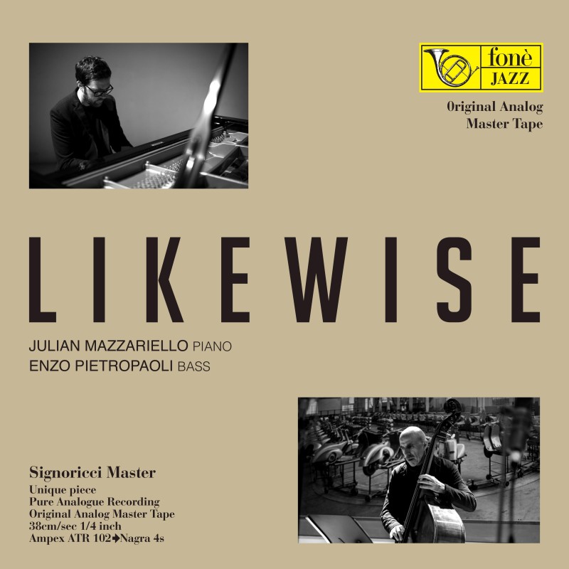Questo album fa parte delle registrazioni che ho realizzato in occasione dei concerti del fonè Music Festival Piaggio edizione 2019 Ho realizzato questa registrazione presso l'Auditorium Piaggio situato all'interno del famoso Museo di Pontedera, luogo dove Piaggio è nata e dove ancora oggi continua a produrre. All'interno del Museo ogni anno il pubblico di tutto il mondo può ammirare la produzione Piaggio realizzata negli anni, tutti i modelli della Vespa e dell'Ape, tutte le moto Aprilia, Gilera e Moto Guzzi che nel tempo hanno vinto premi nazionali e internazionali. Per questa registrazione ho portato tutta la mia attrezzatura sia analogica (Ampex ATR 102 Electronic Tube Ampex Model 351-1965, 2 tracce, 1/2 pollice, 30ips modificata da David Manley) che digitale (Pyramix Recorder, dCS A/D e D/A convertitori). Per quanto riguarda i microfoni ho utilizzato la mia collezione originale di Neumann U47, U48, M49 oltre al preamplificatore microfonico e ai cavi Signoricci. Si utilizzano coppie di microfoni a valvole Neumann degli anni 1947 e 1949 (U47, U48 e M49) dalla timbrica naturalissima usando tecniche bimicrofoniche ad effetto di campo. Questi microfoni hanno una storia importante: sono infatti i microfoni originali utilizzati per registrare tra gli altri, le esecuzioni dei Beatles nello Studio di Abbey Road e dalla RCA per le registrazioni “Living Stereo”. Il suono che riesco a catturare con questi leggendari microfoni è perfettamente in linea con il mio gusto sonoro. Nessun altro microfono ha una timbrica così vera e la capicità di incidere tutte le nuances di suono e tutta la ricchezza degli armonici. L'unicità di questi microfoni è legata alla loro capacità di effettuare una perfetta "fotografia sonora" e di mettere la musica perfettamente collocata nello spazio sonoro scelto per la registrazione. Questo perché per ogni registrazione ho sempre realizzato due Master: un master analogico per i vinili e un master digitale DSD per i SuperAudioCD. La masterizzazione per il vinile è stata da me realizzata utilizzando il sistema Signoricci interamente analogico e valvolare. Un sistema allo "stato dell'arte" senza manipolazione del suono, equalizzazione, riverbero, compressione ed espansione... ma suono naturale e timbrica vero per esaltare al meglio l'acustica dell'Auditorium del Museo Piaggio. fonè propone da quasi 40 anni delle incisioni realizzate all’insegna della ricercatezza tecnologica e miranti al recupero delle atmosfere musicali originali. Anche per questa registrazione ho utilizzato una tecnica di registrazione a "effetto di campo"... tutto questo per far riviver all'ascoltatore nel suo impianto hifi di casa, l'effetto live come se fosse stato presente all'esibizione. Protagonisti di questo album sono Julian Mazzariello piano, Enzo Pietropaoli contrabbasso. Questi due grandi jazzisti hanno suonato e inciso molti dischi insieme, ma è la prima volta che si presentano in formazione duo. Sinceramente è riduttivo definirli duo perchè in ogni brano che hanno interpretato sembravano un solo strumento. Gli artisti hanno alternato brani del repertorio internazionale; da sottolineare Easy to love (Cole Porter) I Loves you porgy (George Gershwin) e due brani degli stessi Mazzariello e Pietropaoli. E' stata veramente magica la loro interpretazione e il dialogo che ogni volta hanno "intrecciato" tra i due strumenti, una totale fusione timbrica, musicale e interpretativa.... un capolavoro! Il natural sound fonè ha valorizzato a pieno tutte le sonorità dei due strumenti